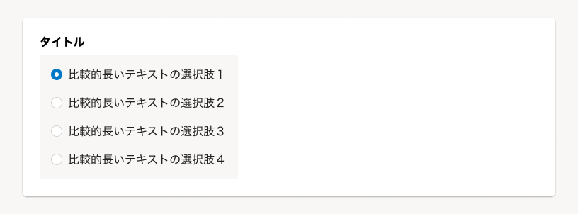 ラジオボタンのラベルテキストは、同程度の文量や行数になるように調整してください。 ラジオボタンは性質上、テキストの文量によって幅が変化します。極端に行数や文量の異なる選択肢が混ざると、ユーザーが視認できる領域の差異が大きくなるため、選択肢を間違える恐れがあります。