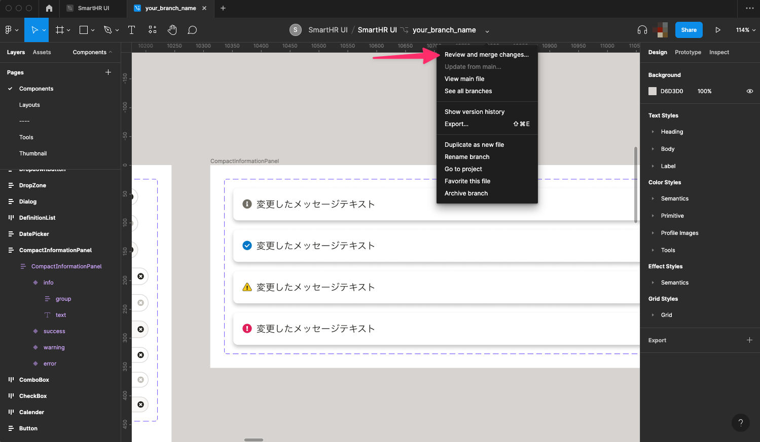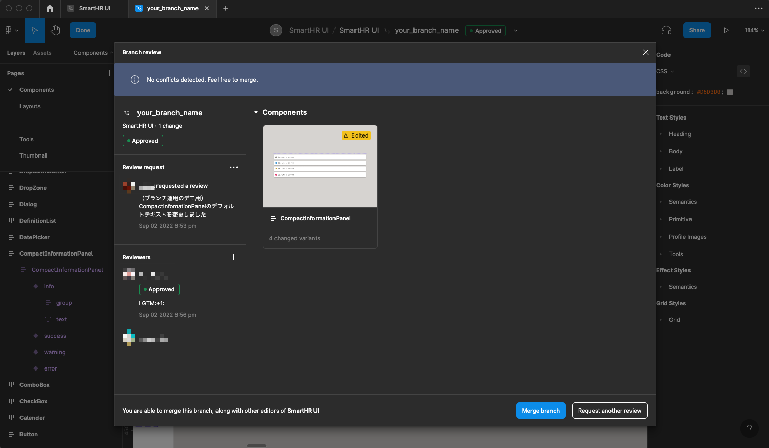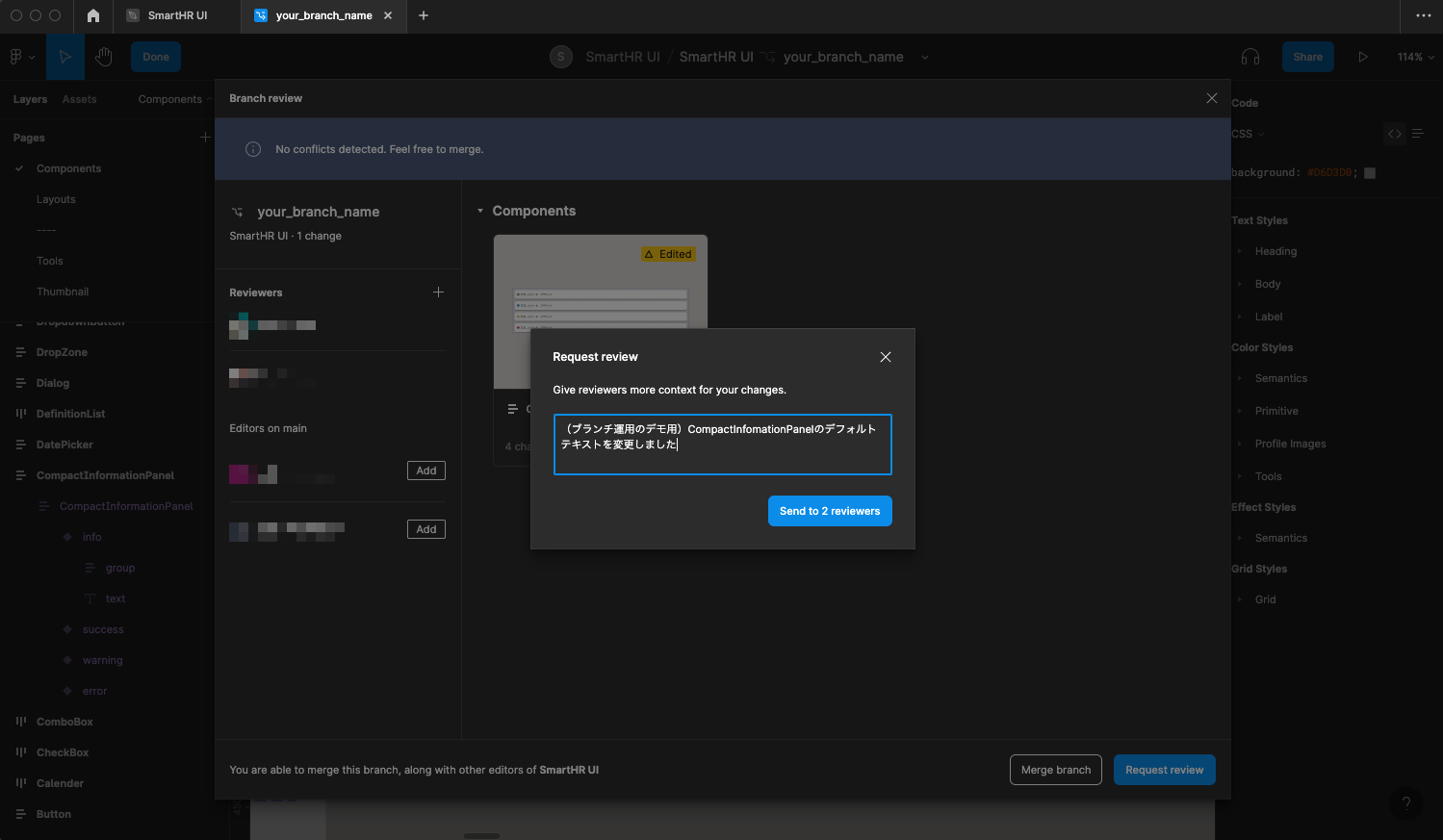 - Text StyleやColor Styleの変更など、必然的に影響範囲が大きくなる場合はその旨をブランチの説明に明記してください。