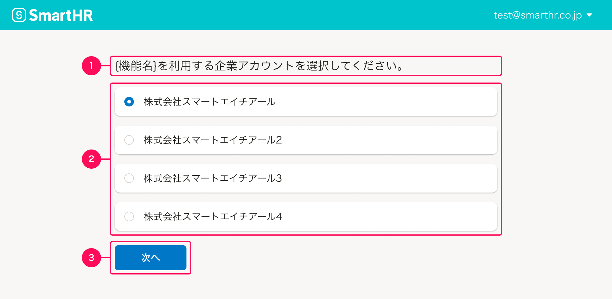 セクションタイトルを使用し、{機能名}を利用する企業アカウントを選択してください。と表記します。