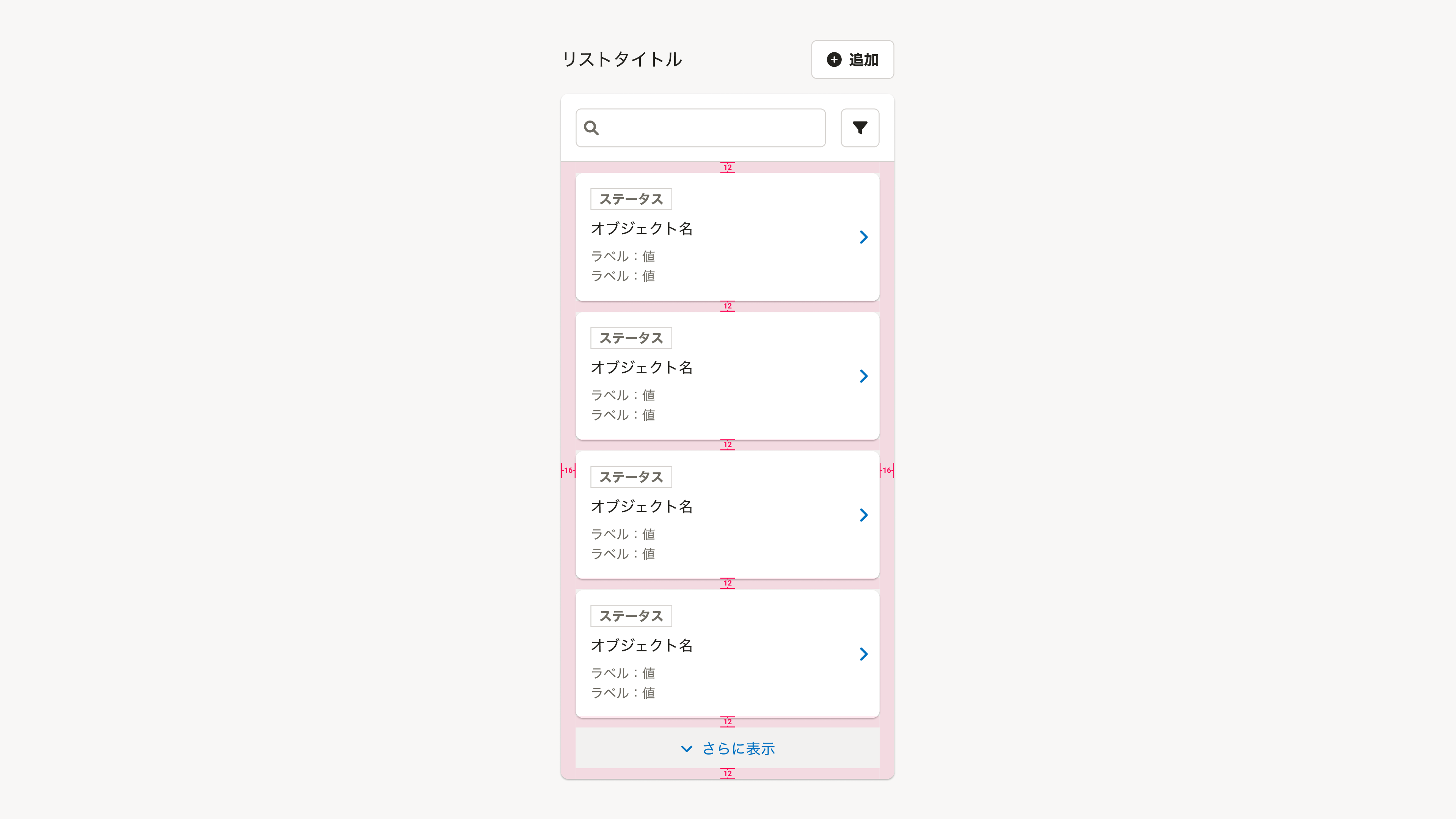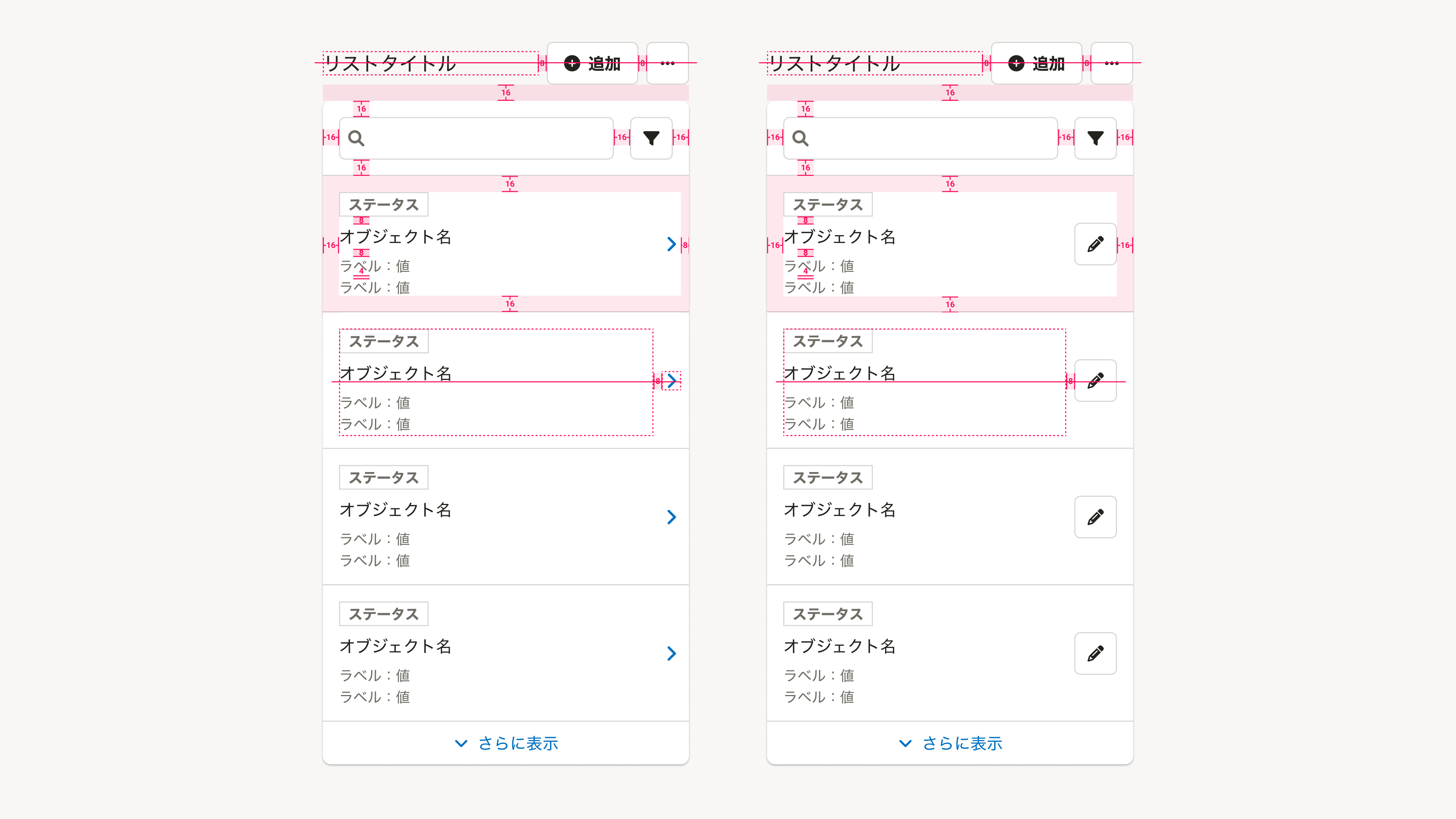 基本的に余白の取り方/モバイルに従って配置しますが、オブジェクトが詳細ビューを持つ場合のリスト項目の右側のPaddingは0.5(8px)とします。
