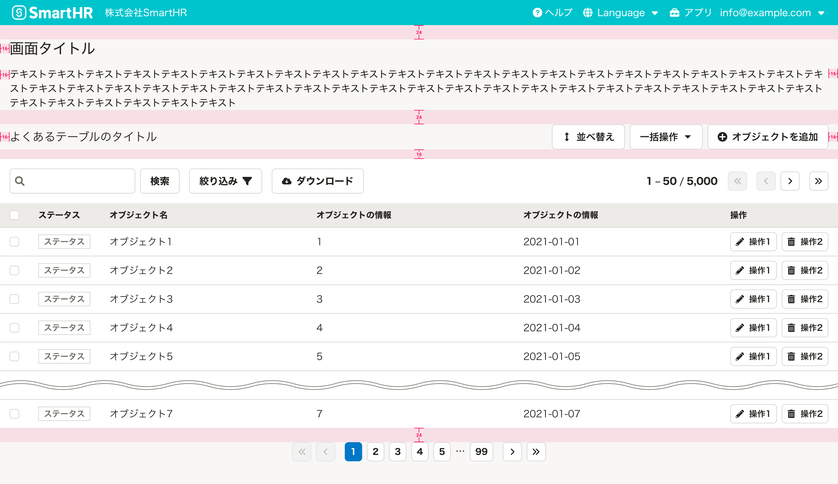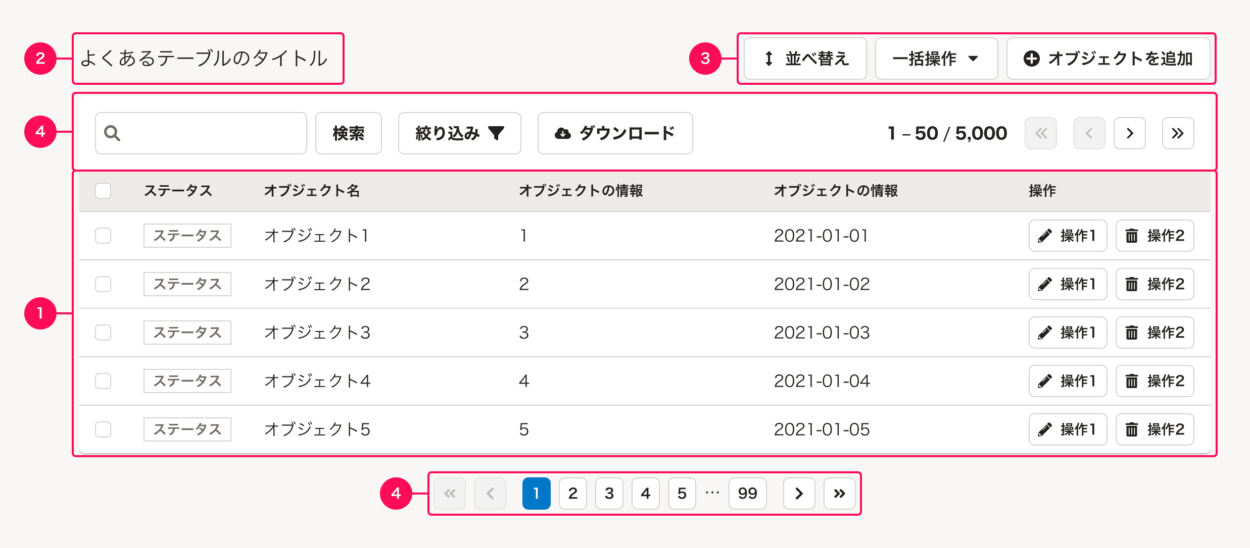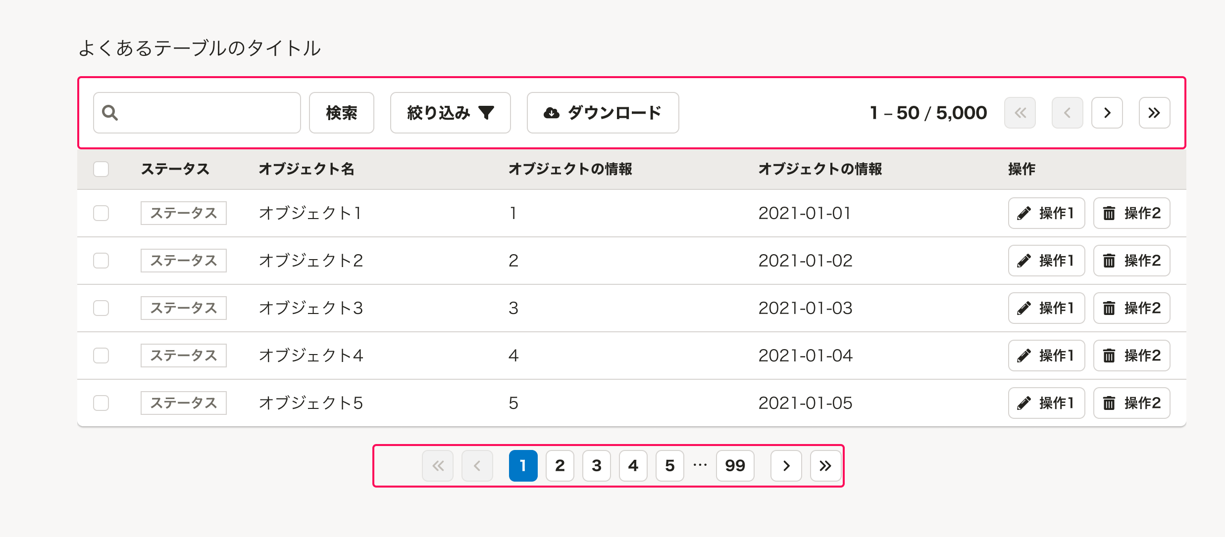 | ページ番号、テーブルのページ数 | 1-50 / 5,000 | PageCounterを配置します。 多くの場合、「 {表示している順番の範囲} / {総件数} 」のように、現在表示しているテーブル内容の現在位置を示します。1ページあたり20件〜50件とすることが多いですが、ユースケースや表示速度を考慮して適切な件数を設定します。 コンテンツの横幅に応じて、表示する内容の量を検討してください。 |