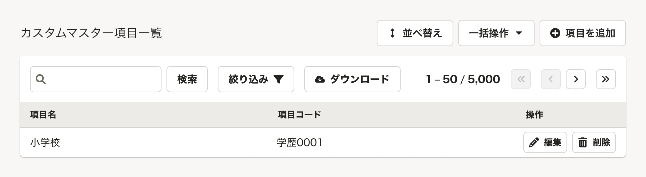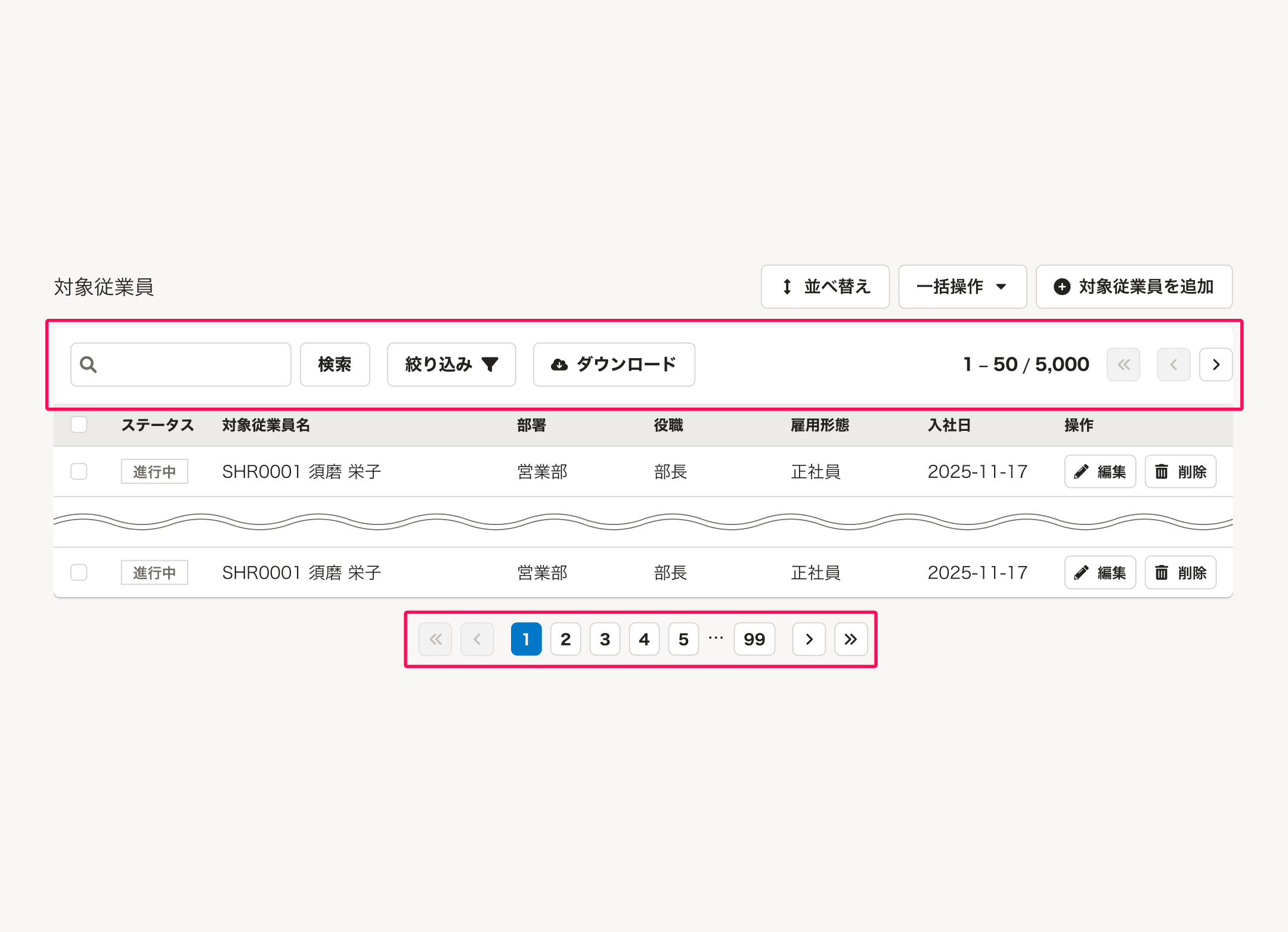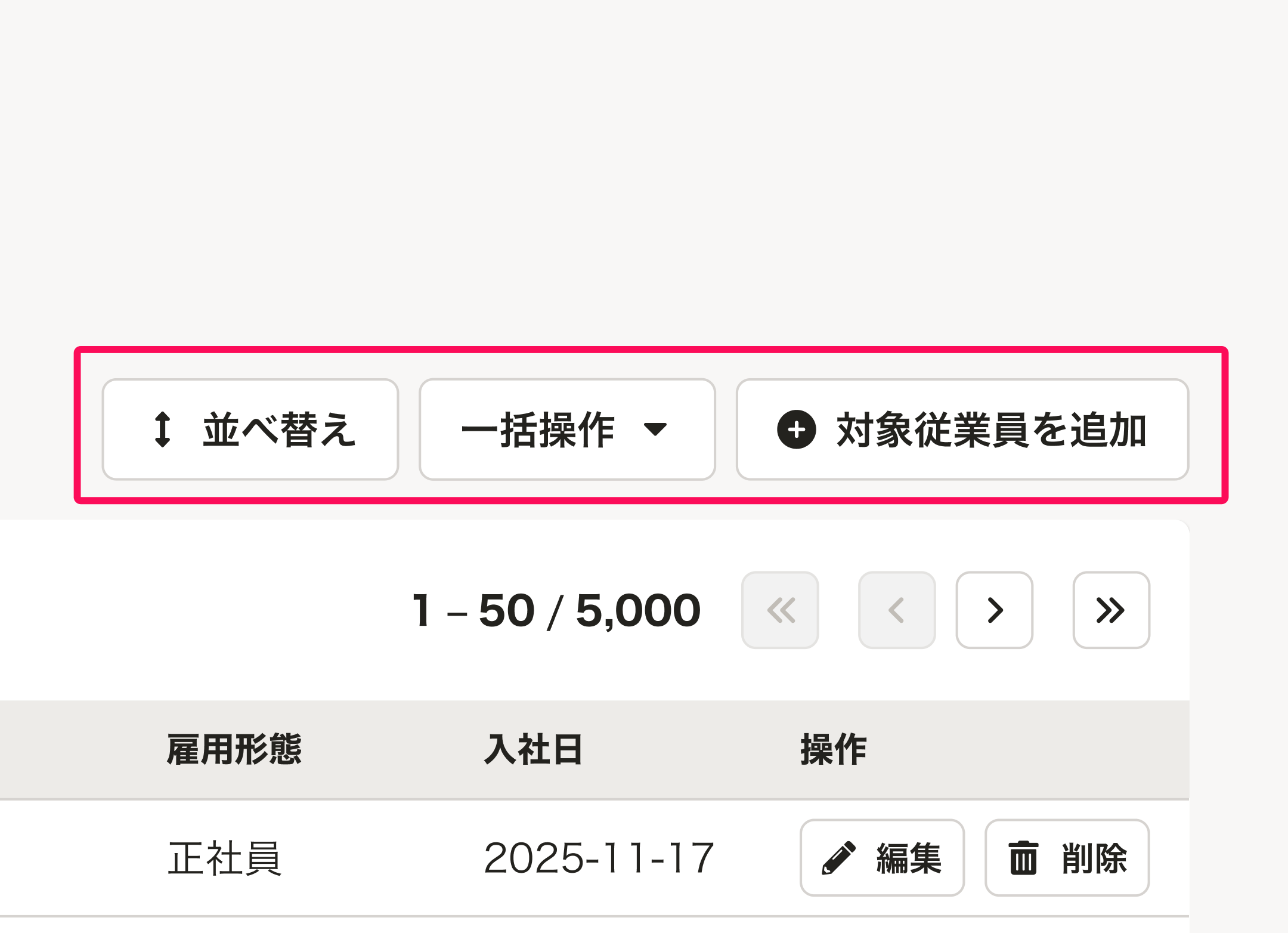 以下に限らず、扱う機能やユースケースによって、データの追加・一括変更などに関わるアクションボタンを配置できます。