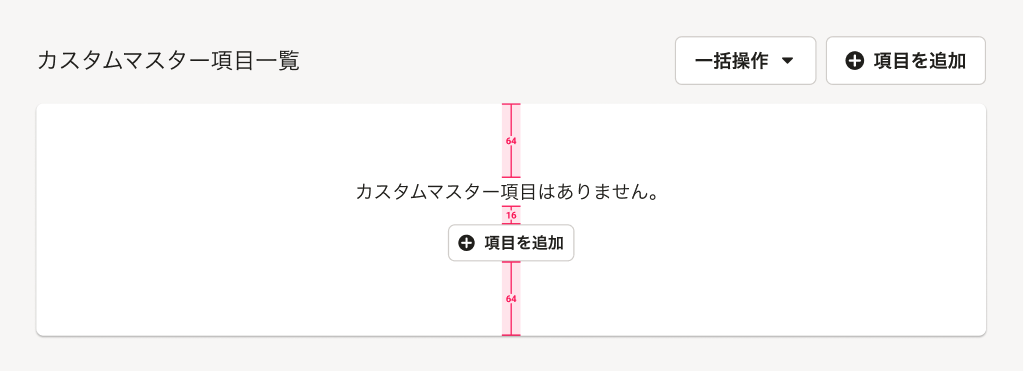 Base内部に、{オブジェクト名}はありません。というメッセージと、オブジェクト追加を促すボタンを上下左右中央に表示します。- オブジェクト追加を促すボタンは、基本的にSecondaryボタンのサイズ小を使います。