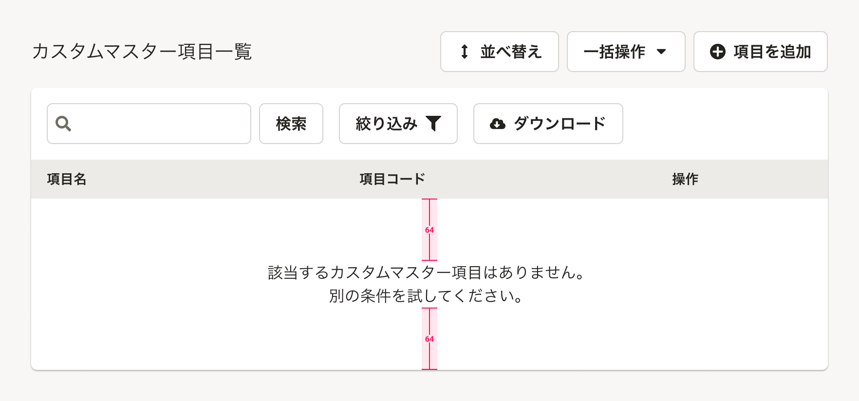 | オブジェクト(一覧)のダウンロード | ダウンロード, 全件ダウンロード | Secondaryボタンのアイコン付き(左)を配置します。(ダウンロード アイコン(FaCloudArrowDownIcon)を使用)オブジェクトの絞り込み状態に依存せず、オブジェクトの全件が常にダウンロードされる場合は、ラベルを 全件ダウンロードとします。 |